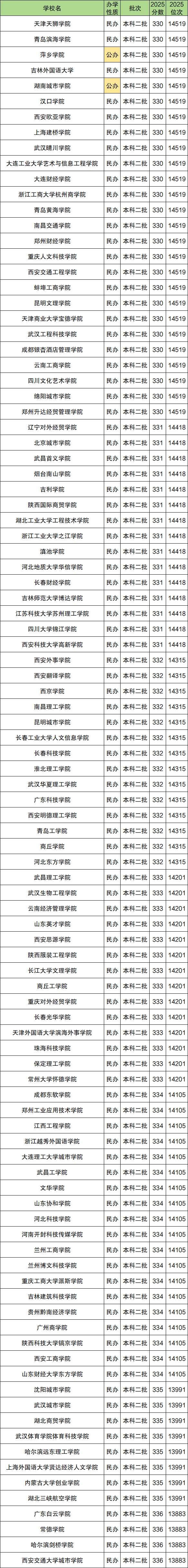 2025年文科录取分数线最低的100所本科学校分数线范围是330分到336分,对应位次从13883名到14519名,完整名单一览表如下(含2所公办):