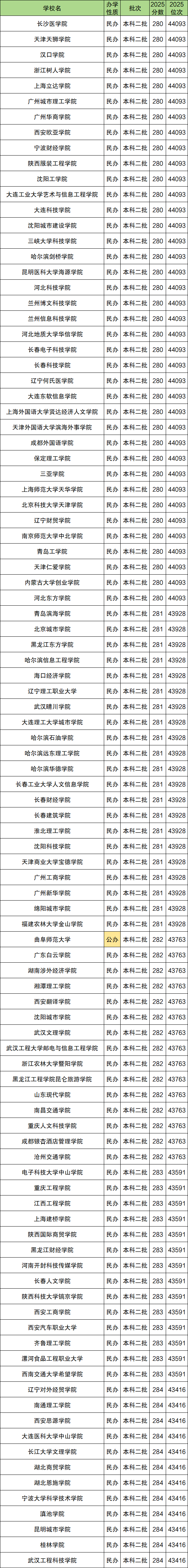 2025年理科录取分数线最低的100所本科学校分数线范围是280分到284分,对应位次从43416名到44093名,完整名单一览表如下(含1所公办):