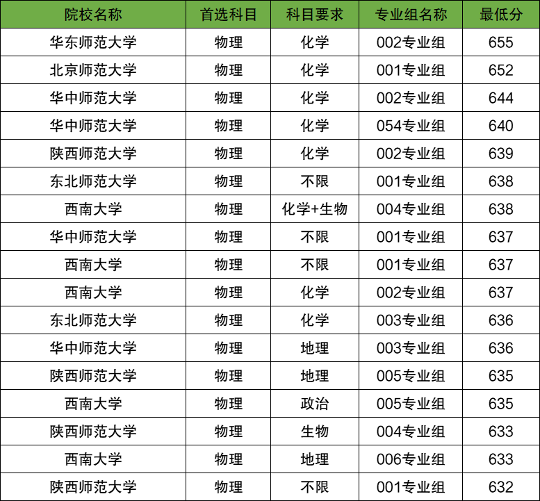 安徽物理类录取分数线最低的公费师范生院校专业组是陕西师范大学001组,2025年的最低录取分数线为632分。