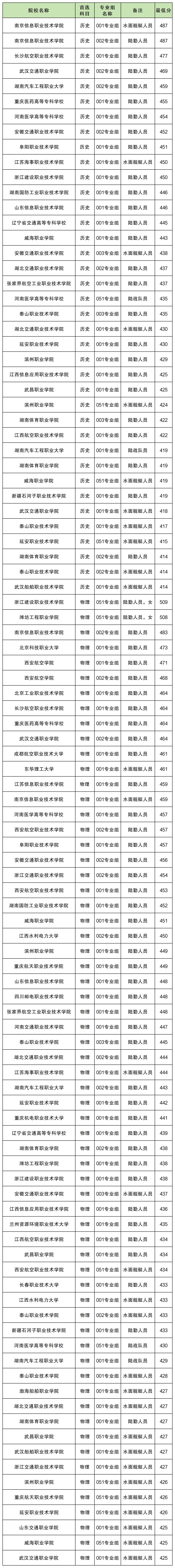 历史类最低录取分数的学校为湖南体育职业学院002专业组、泰山职业技术学院002组和武汉船舶职业技术学院001组,分数均为414分;分数最高的是南京信息职业技术学院001专业组和002专业组,487分。