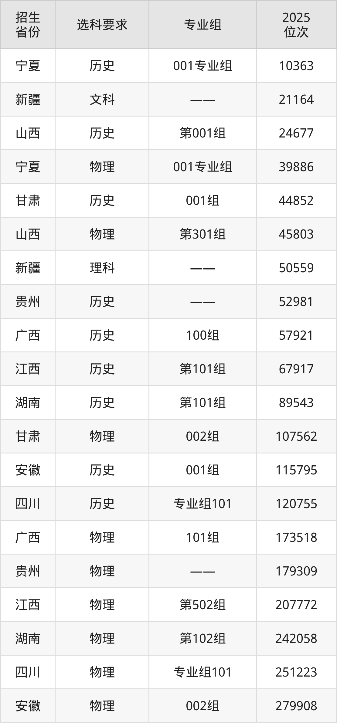 福建林业职业技术学院2025年在全国各省的位次差异较大,最高位次是10363位(宁夏历史类)、最低位次是279908位(安徽物理类)。各省具体位次请看下图: