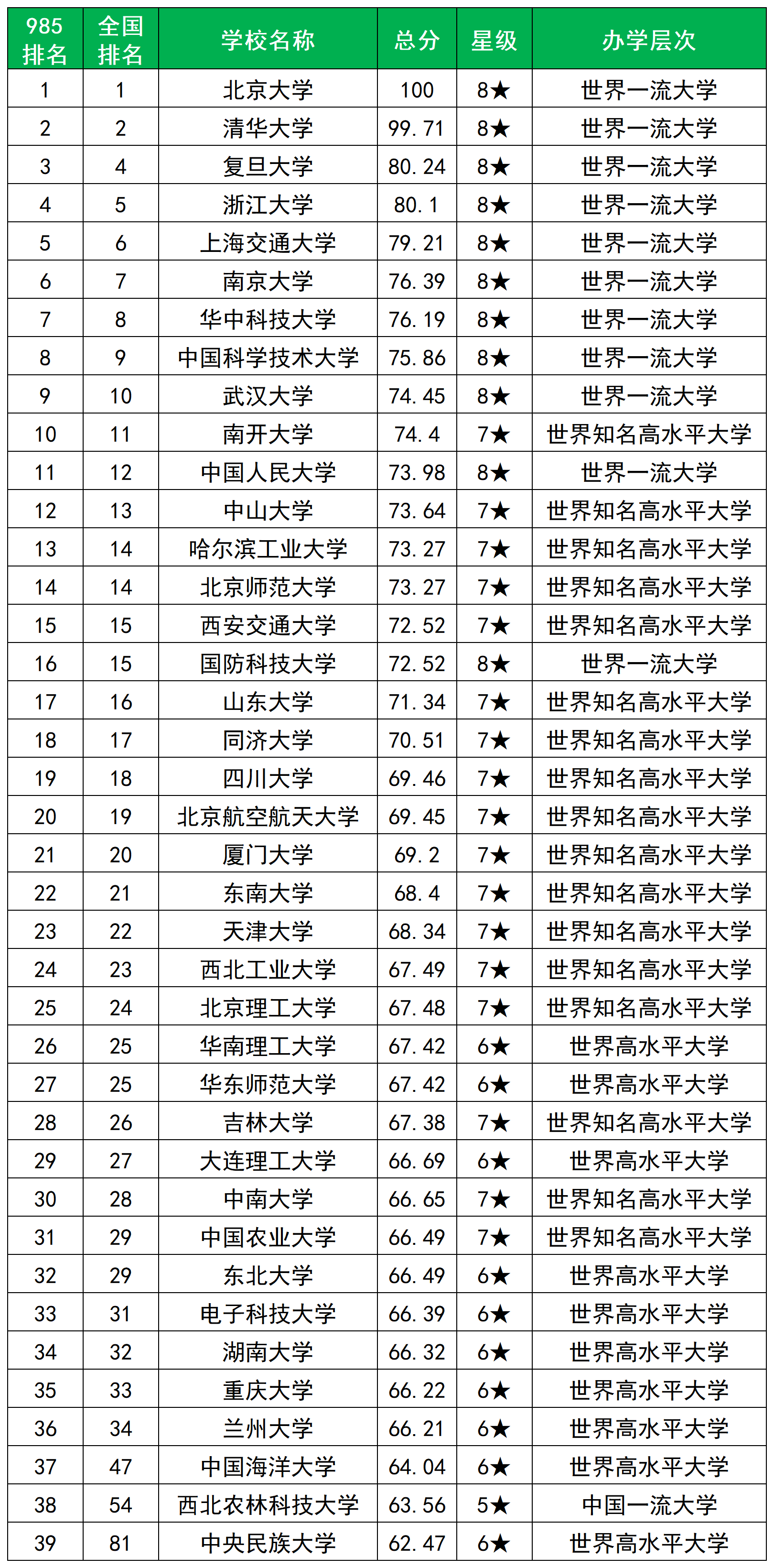在985院校内部排名中,排名前五分别为北京大学、清华大学、复旦大学、浙江大学、上海交通大学。排名后5分别为中央民族大学、西北农林科技大学、中国海洋大学、兰州大学、重庆大学。