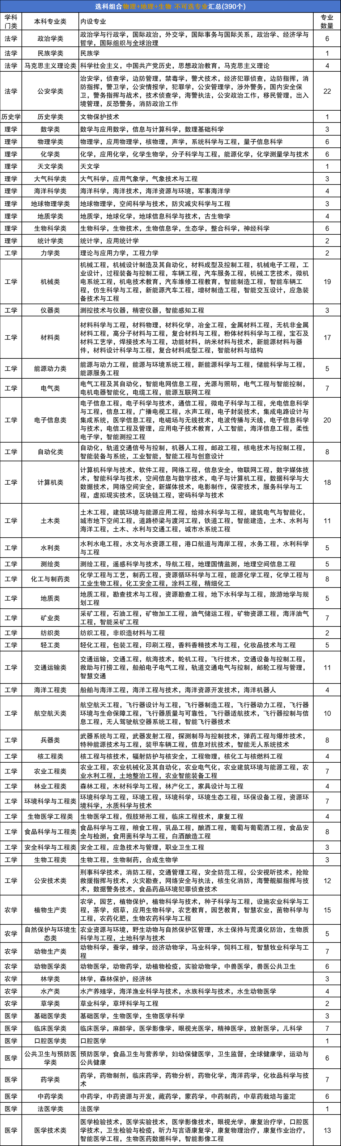 而物生地组合不可选专业共计390个,包含治安学、政治学与行政学、文物保护技术、天文学、地球物理学等,考生报考前需注意专业选科要求,避免无效报考。