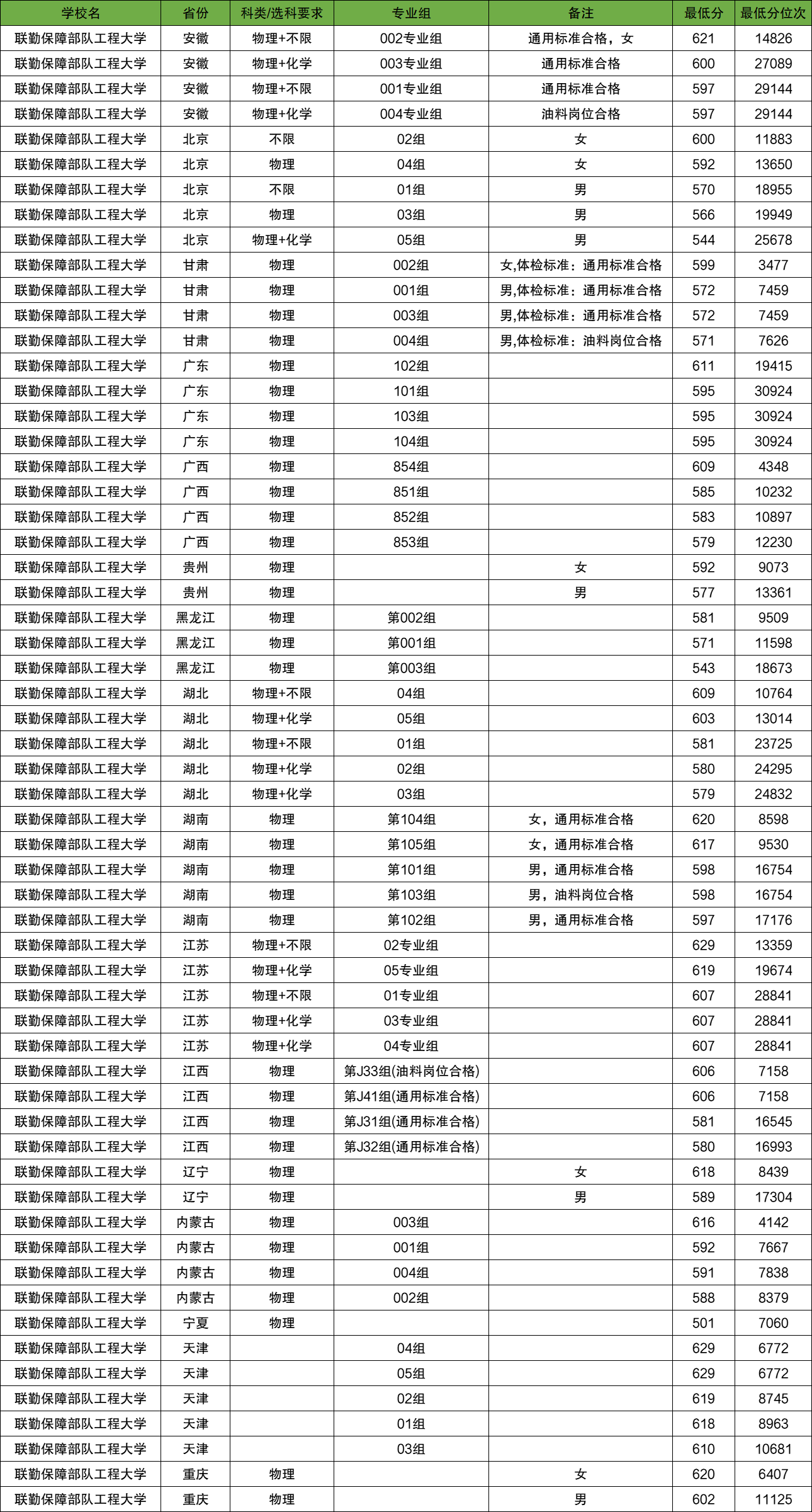 联勤保障部队工程大学02组,2025年女生投档最低600分;