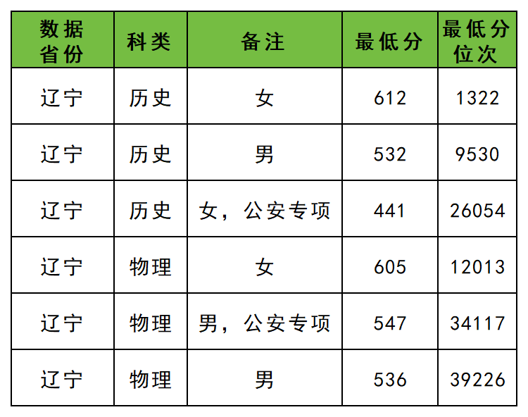 在辽宁,辽宁警察学院录取最低分是441分,但这只是历史类女生公安专项的最低分,如果普通类专业的话女生最低高达612分。如果是物理类的话女生最低分可达605分,男生最低536分。