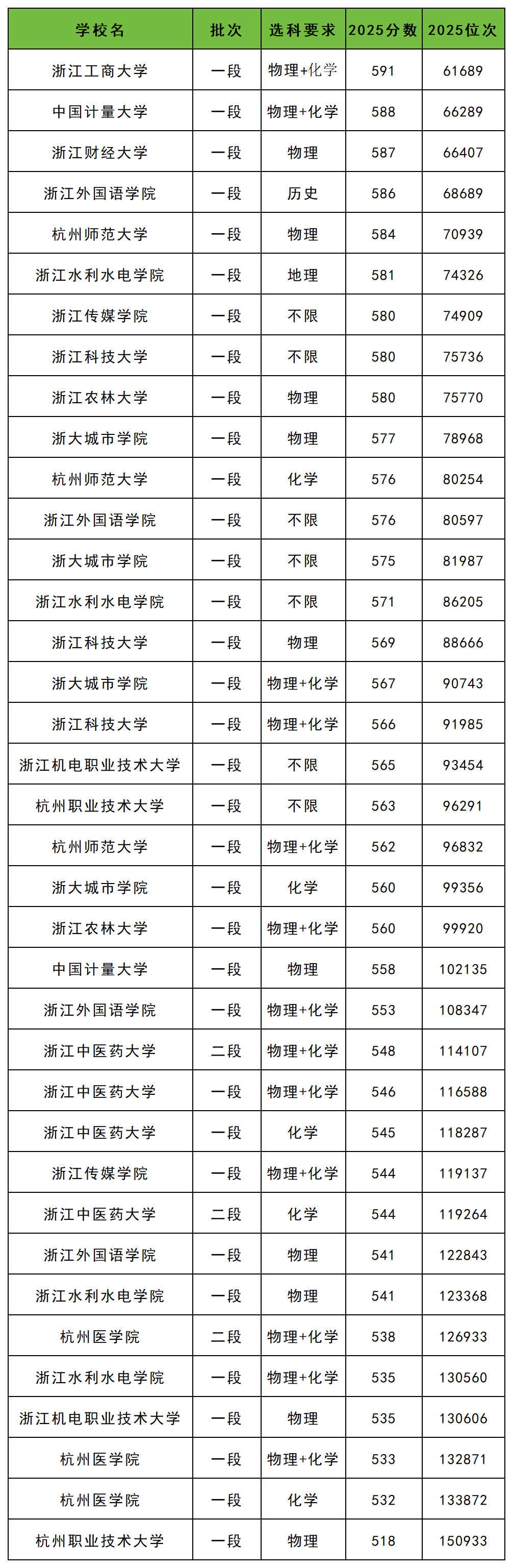 2025年杭州公办二本大学录取分数线从518分到591分之间,对应最低排位从150933名到61689名。