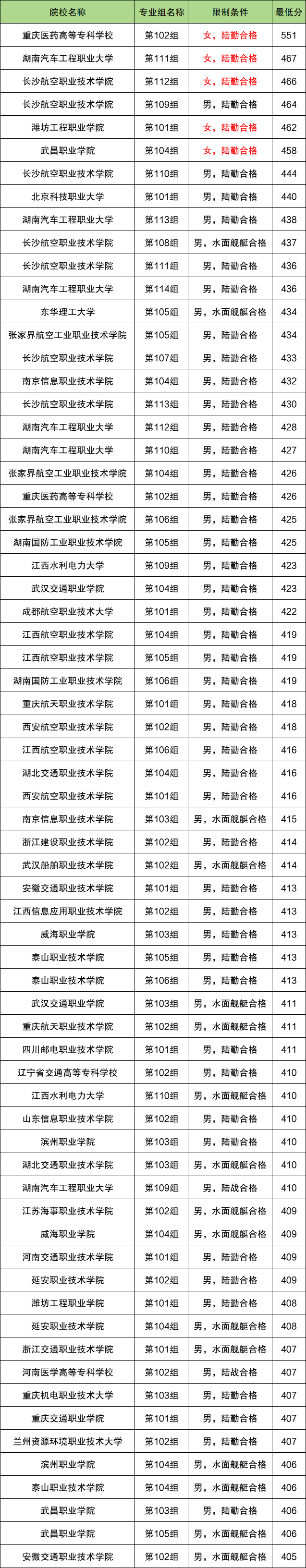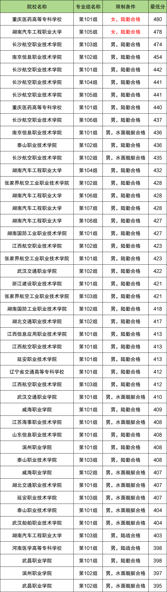 2025年在湖南历史科目组招收女生的士官学校只有2所院校2个专业组,分别是:重庆医药高等专科学校第101组(480分),湖南汽车工程职业大学第105组(478分),均要求陆勤合格。
