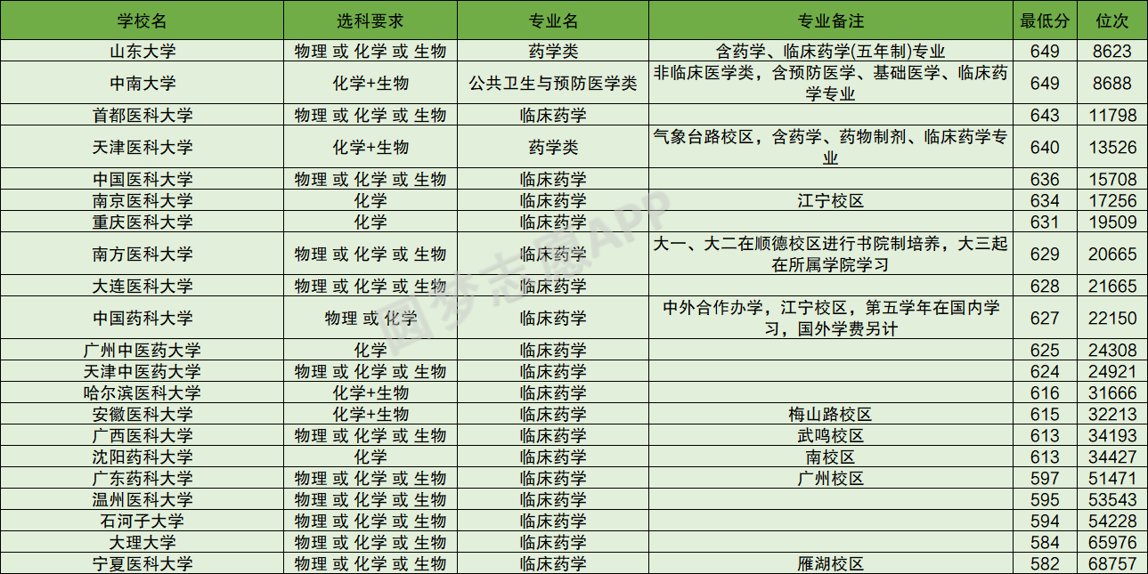 临床药学专业录取分数线最低的2所大学分别为:大理大学、宁夏医科大学。