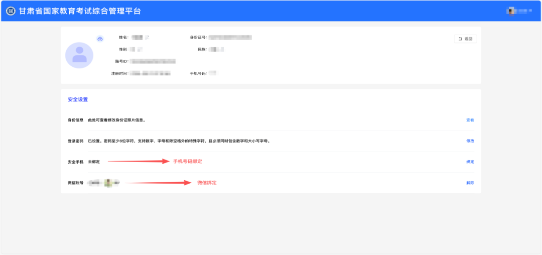 进入注册页面之后,根据页面提示进行注册信息填写,同时点击 “绑定微信账号”,先通过微信扫码关注 “甘肃省教育考试院” 微信公众号,再扫码完成微信账号绑定。后续部分高考相关通知将通过该公众号发送,且部分业务需绑定微信扫码操作。