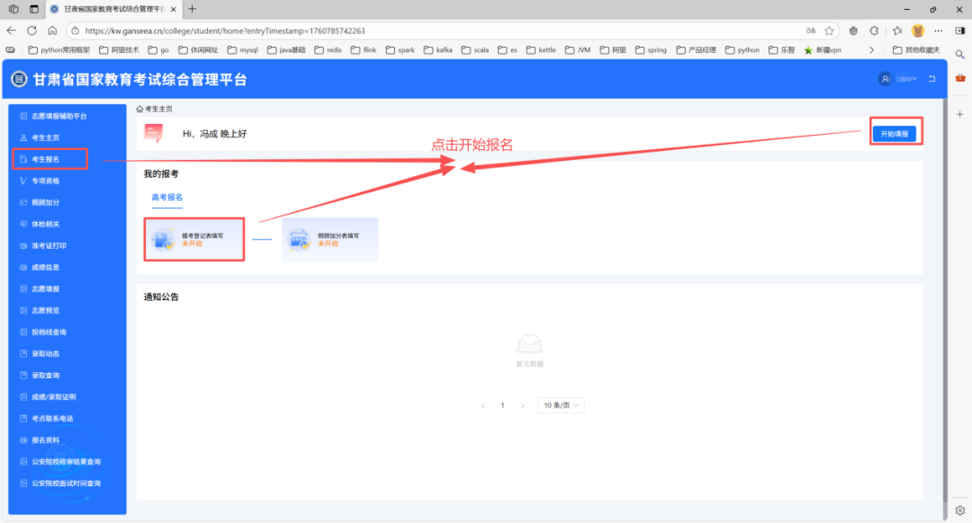在普通高考系统界面,点击 “考生报名” 菜单下的 “高考报名” 选项,启动报名流程。