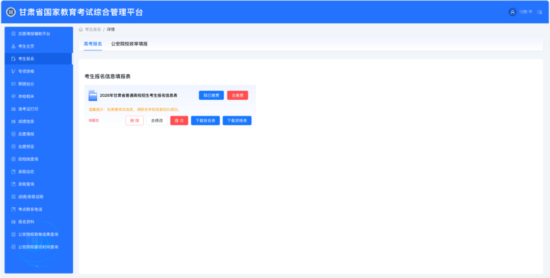 (2)已提交时:提交后无法自行修改,需联系学校或当地招考办,申请退回报名信息,待信息退回后修正,修正完成后重新提交。