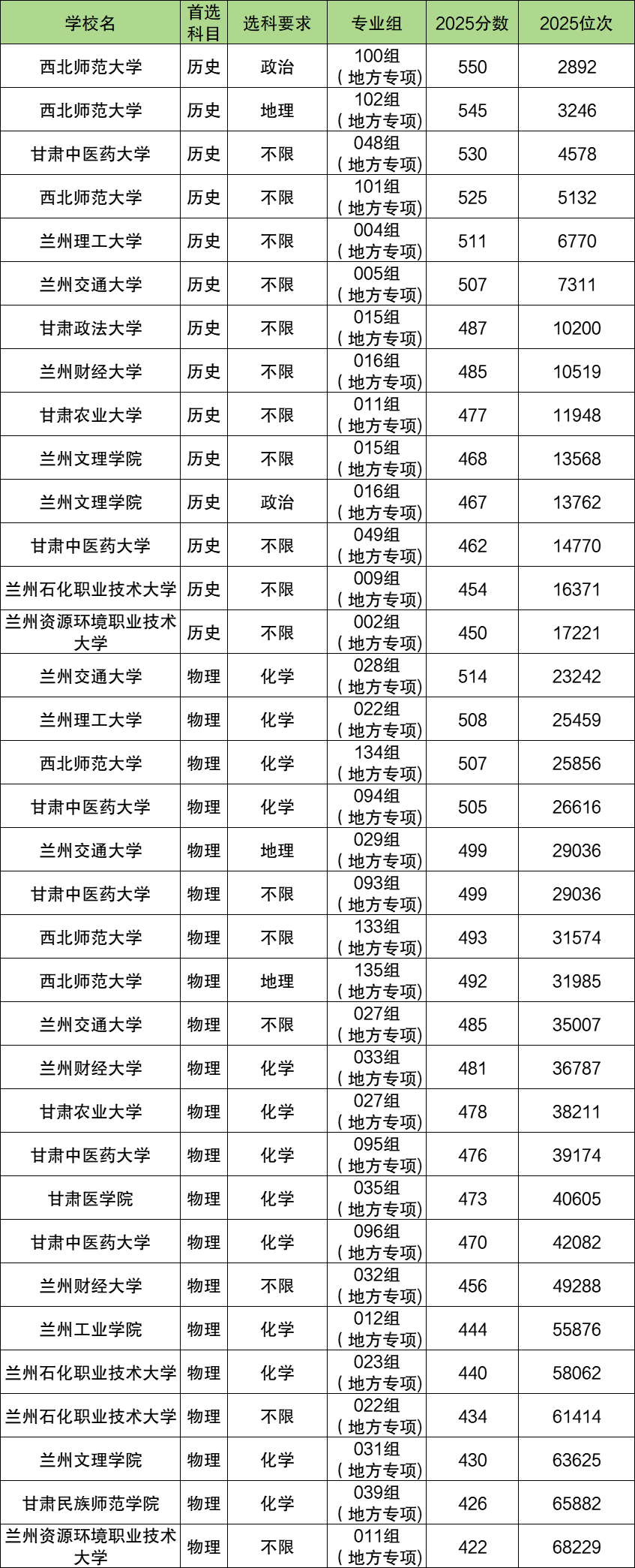 历史类中低分梯队覆盖多元院校,适配不同分数需求。中间梯队以兰州理工大学、兰州交通大学为代表,兰州理工大学第004组(地方专项)511分、兰州交通大学第005组(地方专项)507分,适合中等分数考生;基础梯队分数集中在450-487分,甘肃政法大学第015组(地方专项)487分、兰州财经大学第016组(地方专项)485分,兰州文理学院第015组(地方专项)468分,兰州资源环境职业技术大学第002组(地方专项)450分,为分数偏低考生提供稳妥选择。