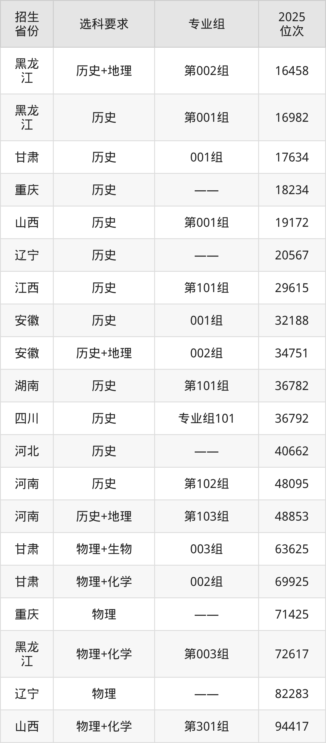 西藏农牧大学2025年在全国各省的位次差异较大,最高位次是16458位(黑龙江历史类)、最低位次是282398位(山东)。各省具体位次请看下图: