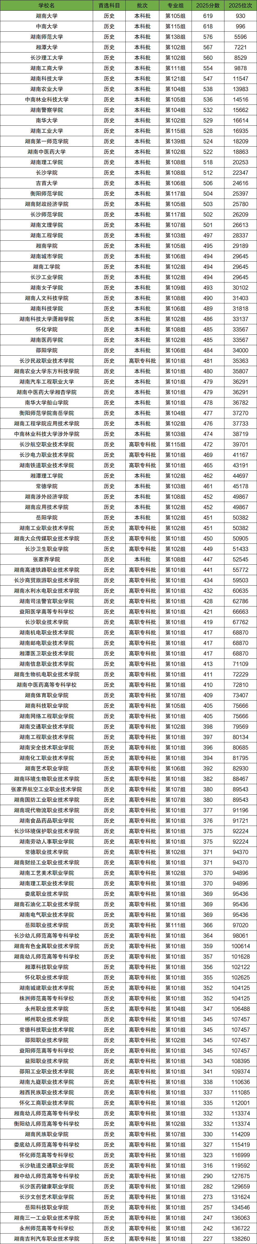 下面是2025年湖南历史类大学最低录取位次及分数一览表(图片较长,需滑动查阅):
