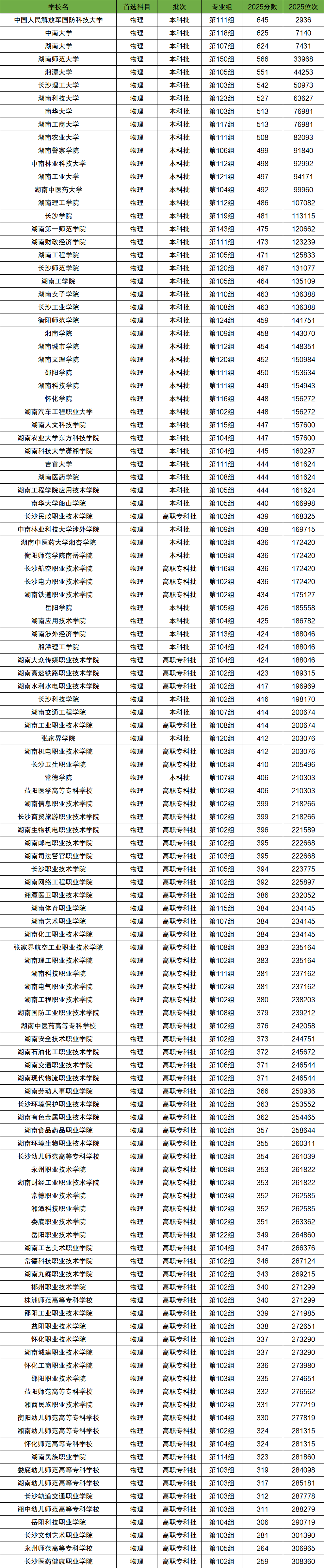 二、2025湖南高考物理类大学录取位次
