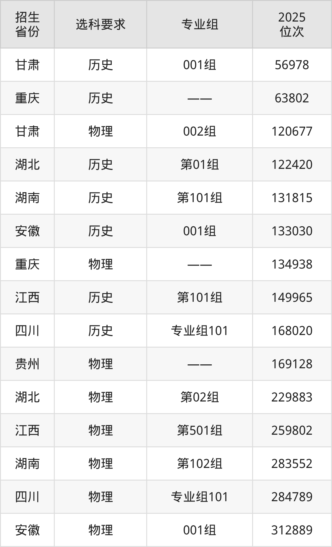 湖北开放职业学院2025年在全国各省的位次差异较大,最高位次是56978位(甘肃历史类)、最低位次是312889位(安徽物理类)。各省具体位次请看下图: