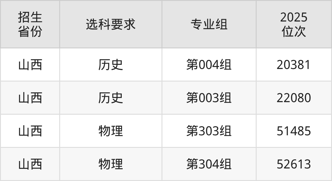 山西警官职业学院2025年的位次差异较大,最高位次是20381位(山西历史类)、最低位次是52613位(山西物理类)。具体位次请看下图: