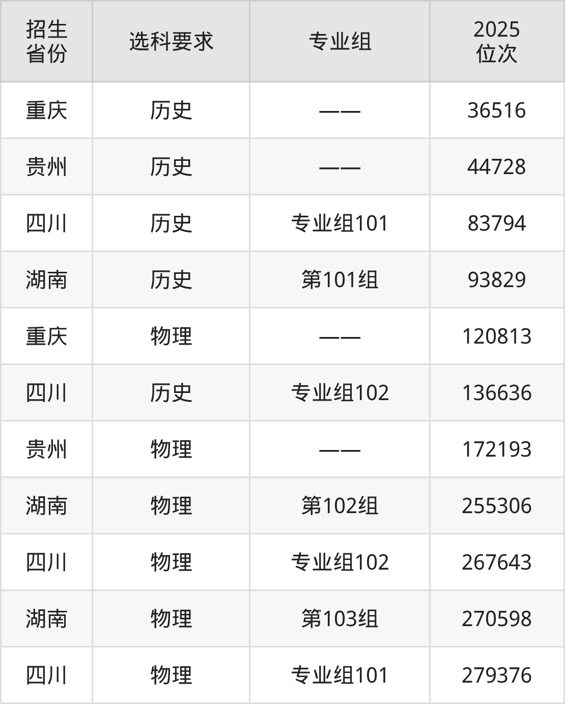 达州职业技术学院2025年在全国各省的位次差异较大,最高位次是36516位(重庆历史类)、最低位次是279376位(四川物理类)。各省具体位次请看下图: