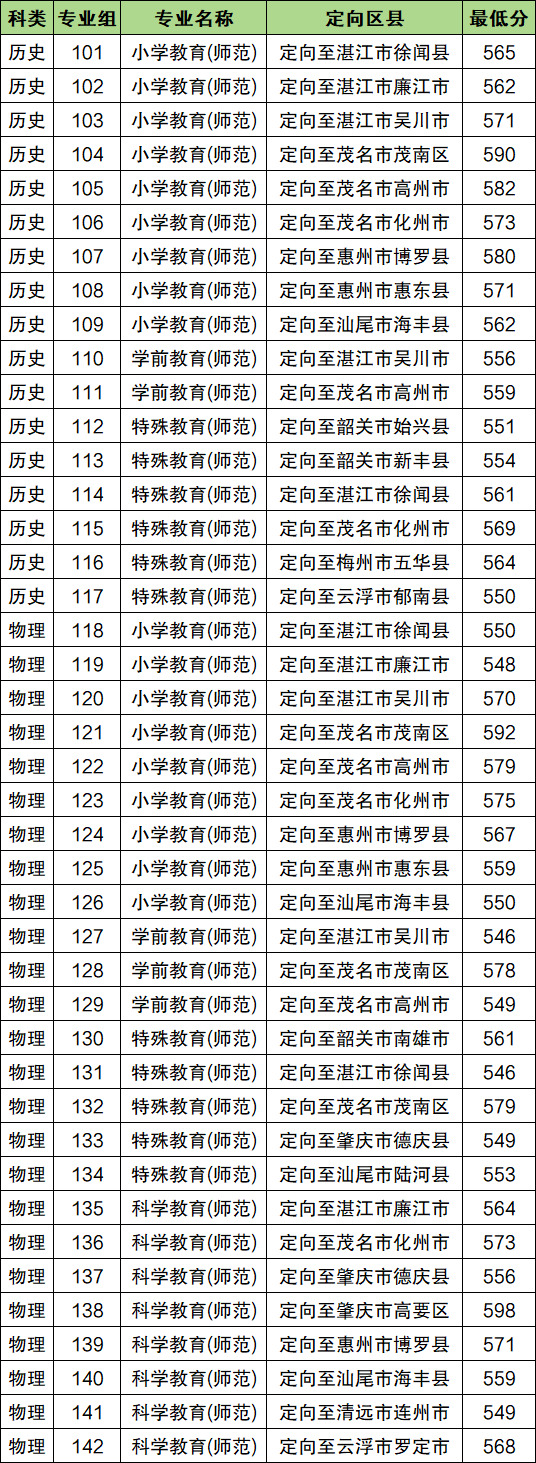 2025年岭南师范学院公费师范生最低分:历史类550分(第117组),定向至云浮市郁南县;物理类546分(第127组),定向至湛江市吴川市。