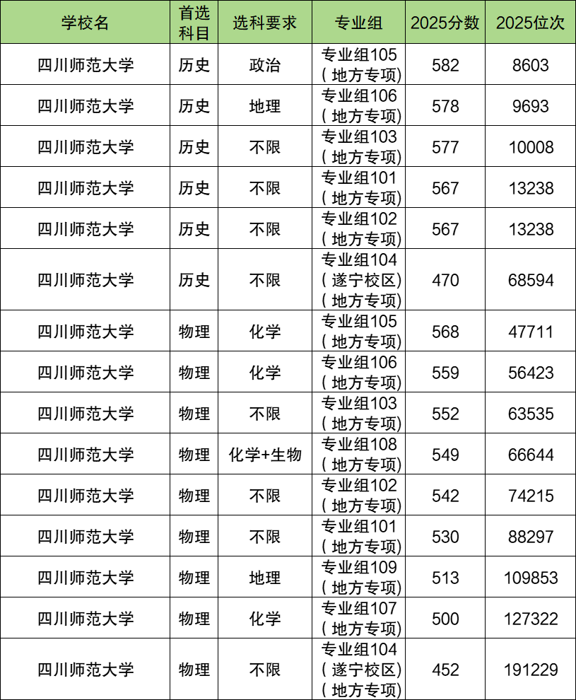 四川师范大学地方专项计划覆盖历史、物理两大首选科目,专业组包含普通校区及遂宁校区两类,分数区间差异显著:历史类为470-582分,物理类为452-568分,既满足高分考生对优质专业组的需求,也为分数偏低考生提供遂宁校区的适配选择。