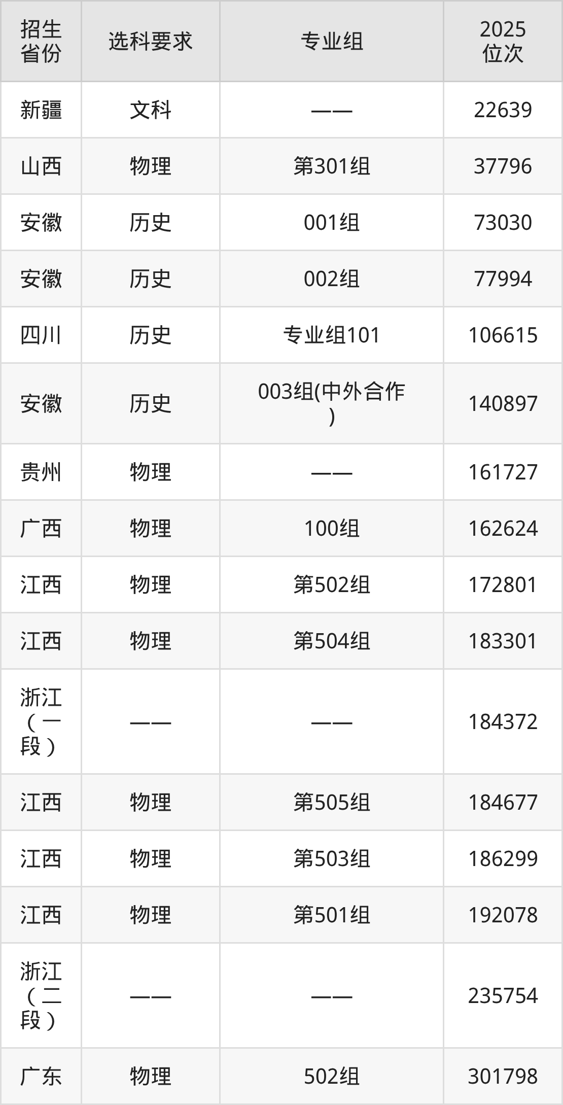 台州科技职业学院2025年在全国各省的位次差异较大,最高位次是22639位(新疆文科)、最低位次是301798位(广东物理类)。各省具体位次请看下图: