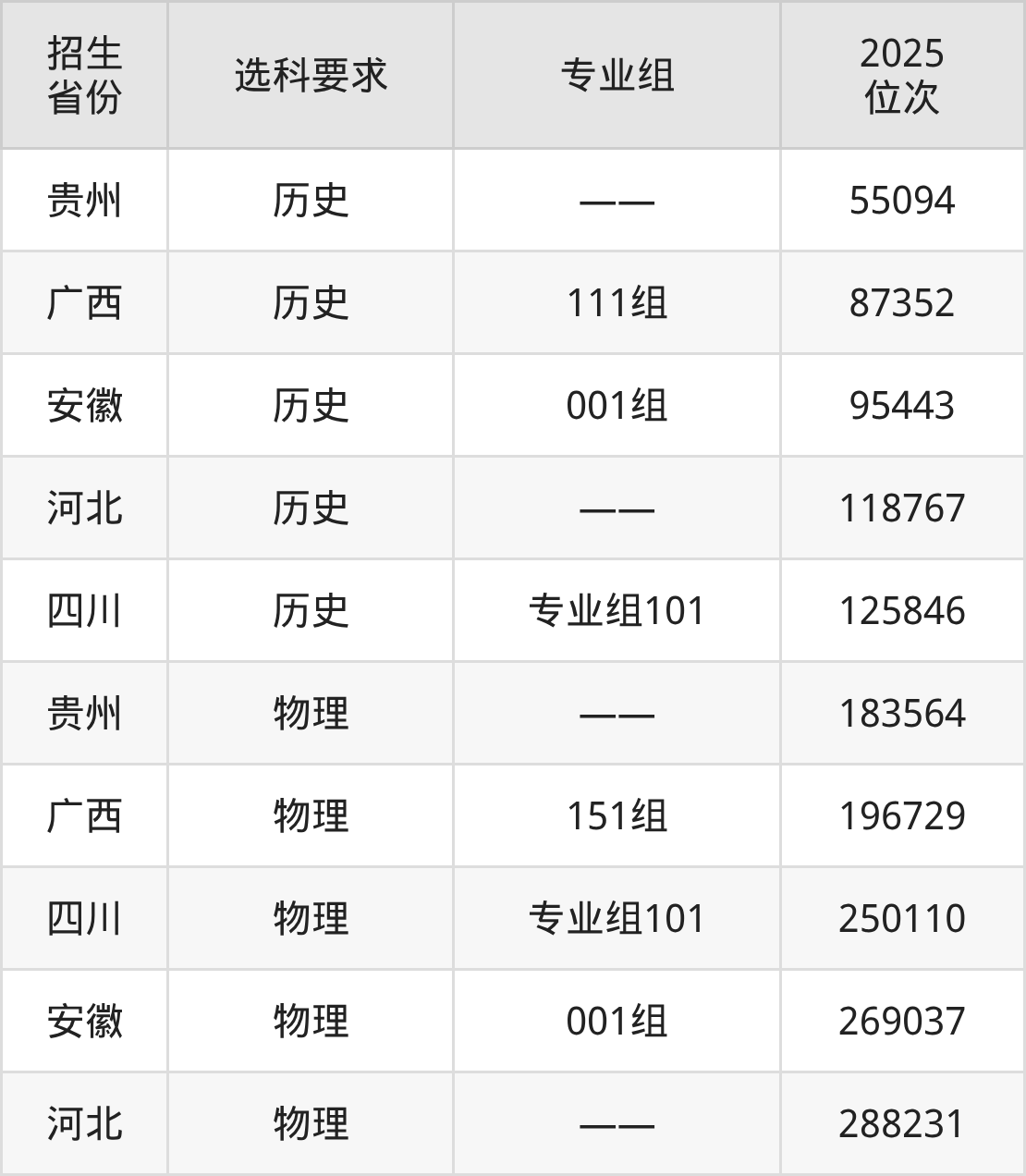 安徽电子信息职业技术学院2025年在全国各省的位次差异较大,最高位次是55094位(贵州历史类)、最低位次是288231位(河北物理类)。各省具体位次请看下图: