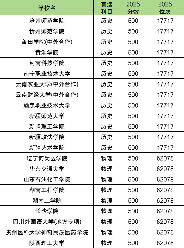 重庆高考500分物理类位次是62078名,对应能上的学校有辽宁何氏医学院、华东交通大学、湖南工学院、长沙学院、陕西理工大学等;历史类500分位次是17717名,对应的大学有黄淮学院、沧州师范学院、新疆师范大学、南宁职业技术大学等,具体名单如下表所示: