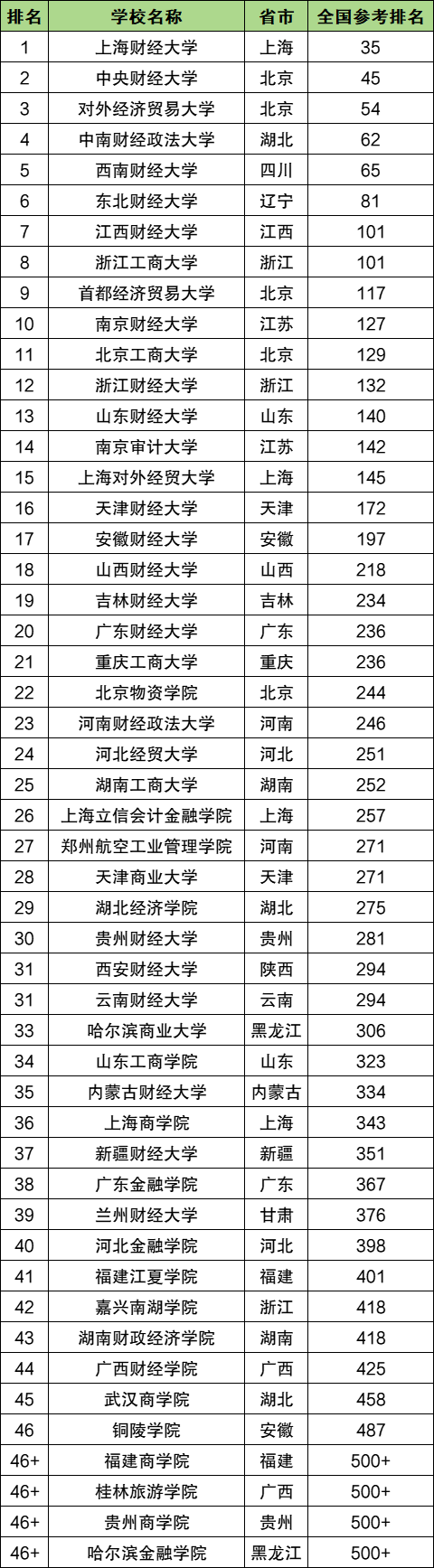 财经类实力最强的是上海财经大学,综合实力位居全国第35名,是财经类最好的大学。此外排名前五的还有中央财经大学(45名)、对外经济贸易大学(54名)、中南财经政法大学(62名)、西南财经大学(65名)。