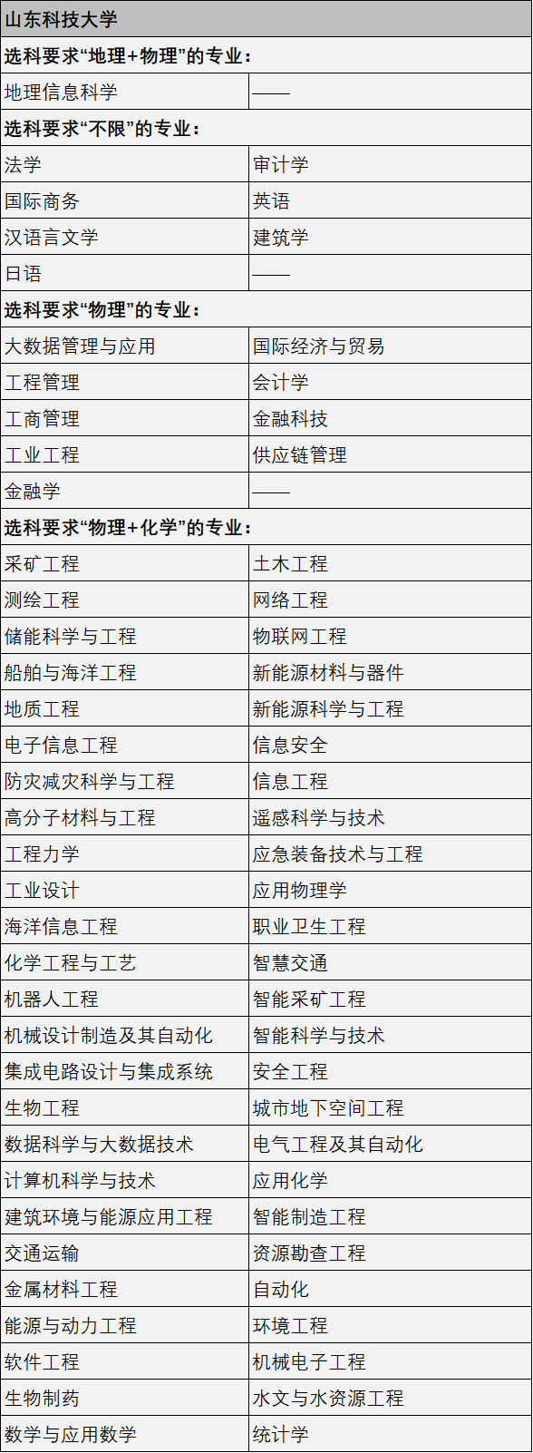 以山东高考为例,山东科技大学要求考生必选“物理+化学”的专业个数最多(51个),其次是“物理”(9个)、“不限选科要求”(7个)。要求考生选“地理+物理”的专业个数最少,仅1个专业(地理信息科学)。老师在下方给大家汇总了山东科技大学各个专业的选科要求,所有省市2026年高考生均可参考!