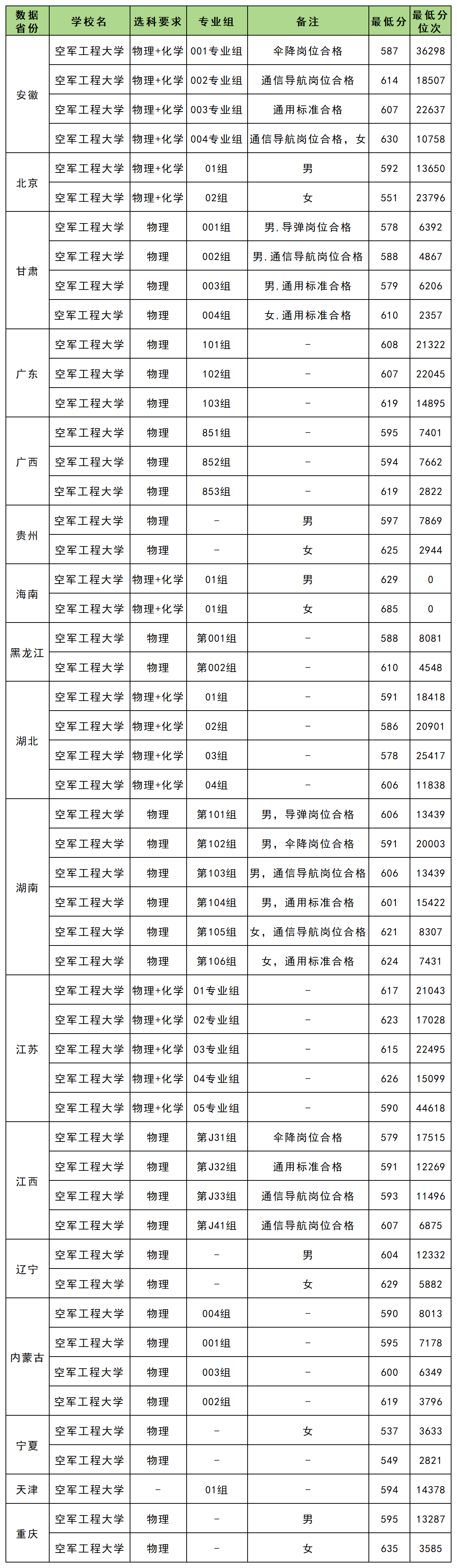 空军工程大学在广东提前批仅在物理组招生,分专业组公布的投档分数线,具体各专业组的投档分数线为: