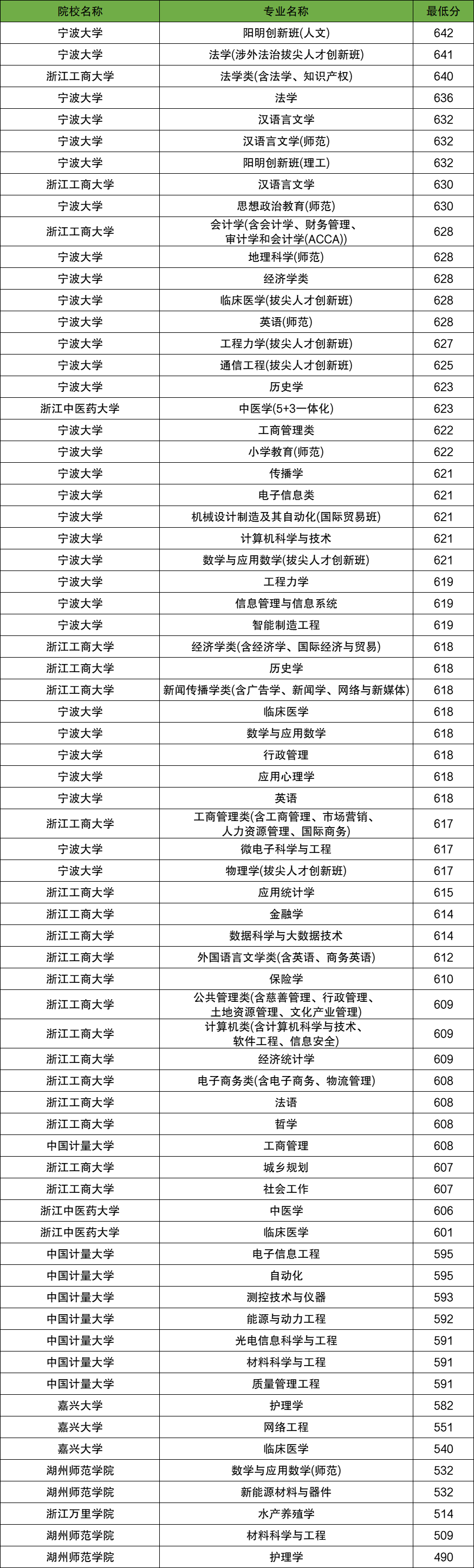 2025年浙江省地方专项计划录取分数线最高为642分,录取院校专业为宁波大学阳明创新班(人文);最低为490分,录取院校专业为湖州师范学院护理学。