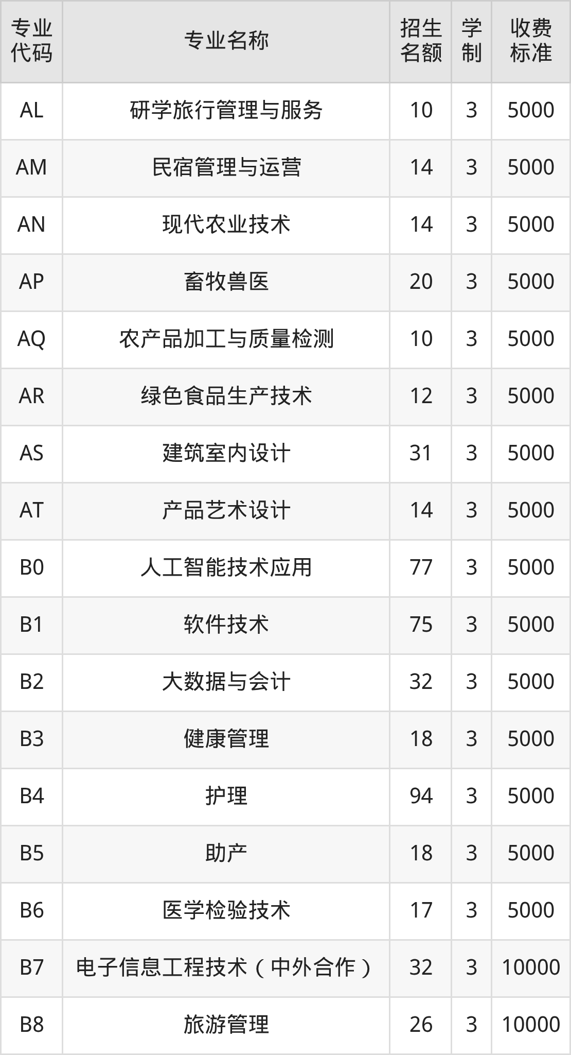 | 专业 代码 | 专业名称 | 招生 名额 | 学 制 | 收费 标准 |