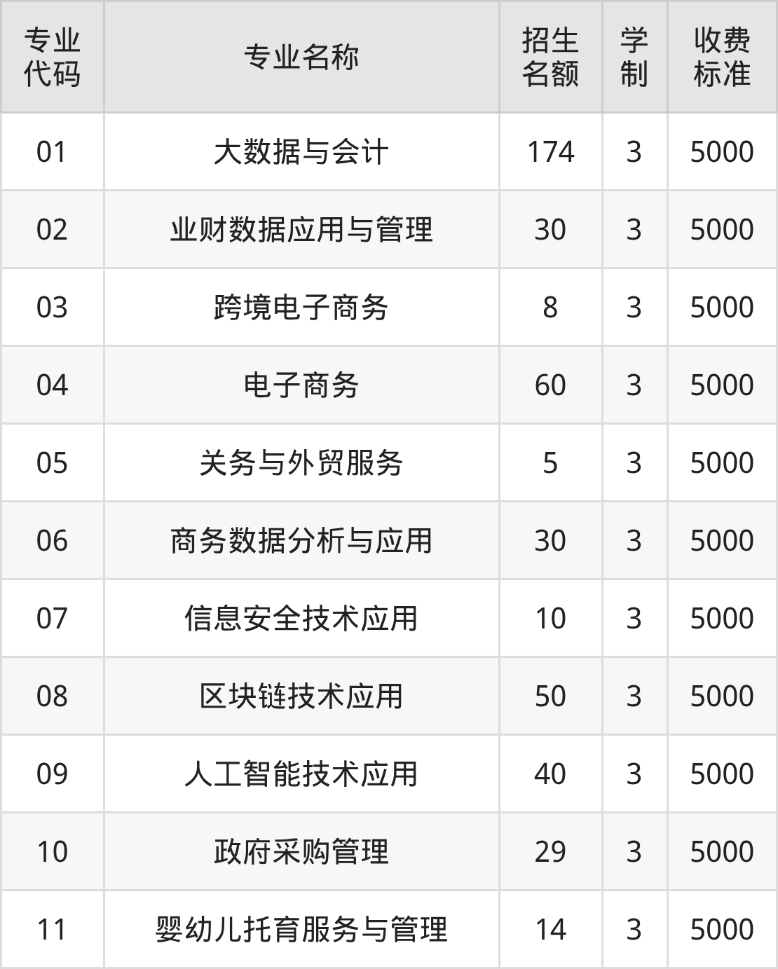 云南财经职业学院大数据与会计专业在专科批历史类招117人,学制3年,专业招生代码是01,学费是5000元一年。云南财经职业学院业财数据应用与管理专业在专科批历史类招20人,学制3年,专业招生代码是02,学费是5000元一年。