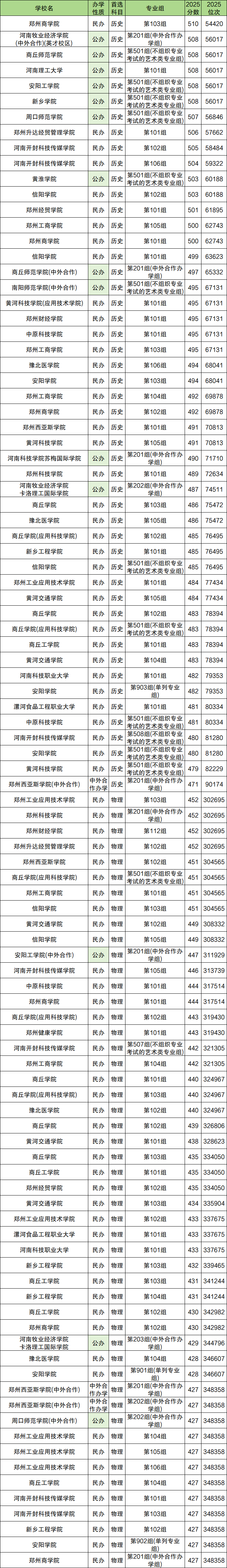 其中河南录取分数线最低的公办二本大学:历史类为河南牧业经济学院卡洛理工国际学院,2025年最低分为487分;物理类为周口师范学院(中外合作),2025年最低分为427分。