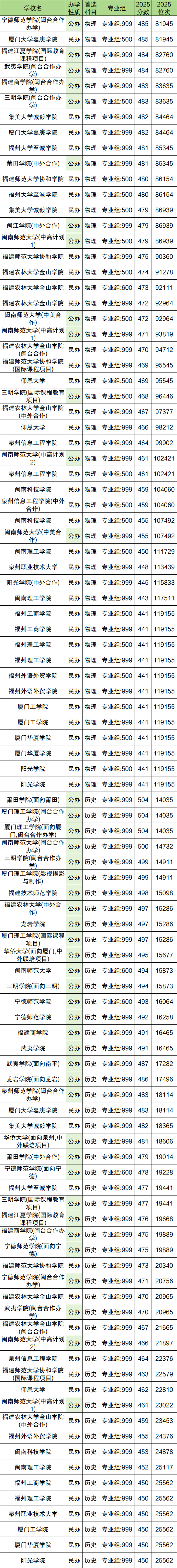 其中福建二本线最低的公办大学:历史类是闽南师范大学(中高计划1),2025年最低461分(过线11分);物理类是闽南师范大学(中美合作),2025年最低455分(过线14分)。