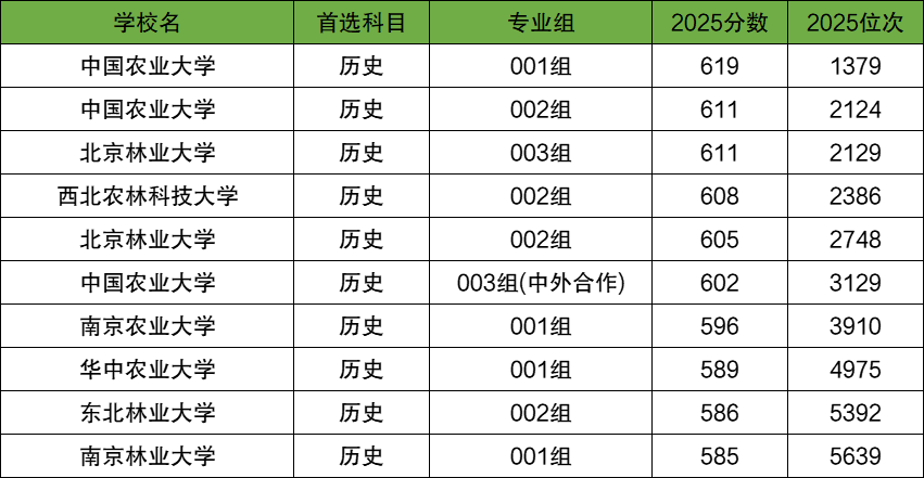 农业大学排名为:第一名中国农业大学、第二名华中农业大学、第三名南京农业大学,而参考安徽2025年历史类录取数据,农业大学录取分数线为:中国农业大学001组619分、南京农业大学001组596分等。