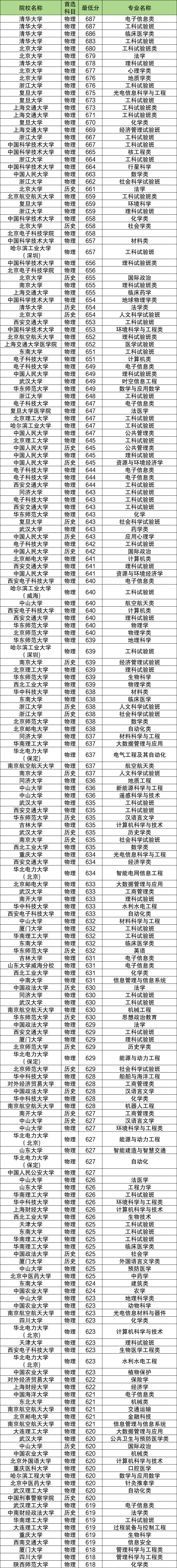 代表院校-专业-分数:清华大学(电子信息类)687分、北京大学(工科试验班类)680分、上海交通大学医学院(医学试验班)652分、电子科技大学(计算机类)651分、哈尔滨工业大学(工科试验班)647分等。