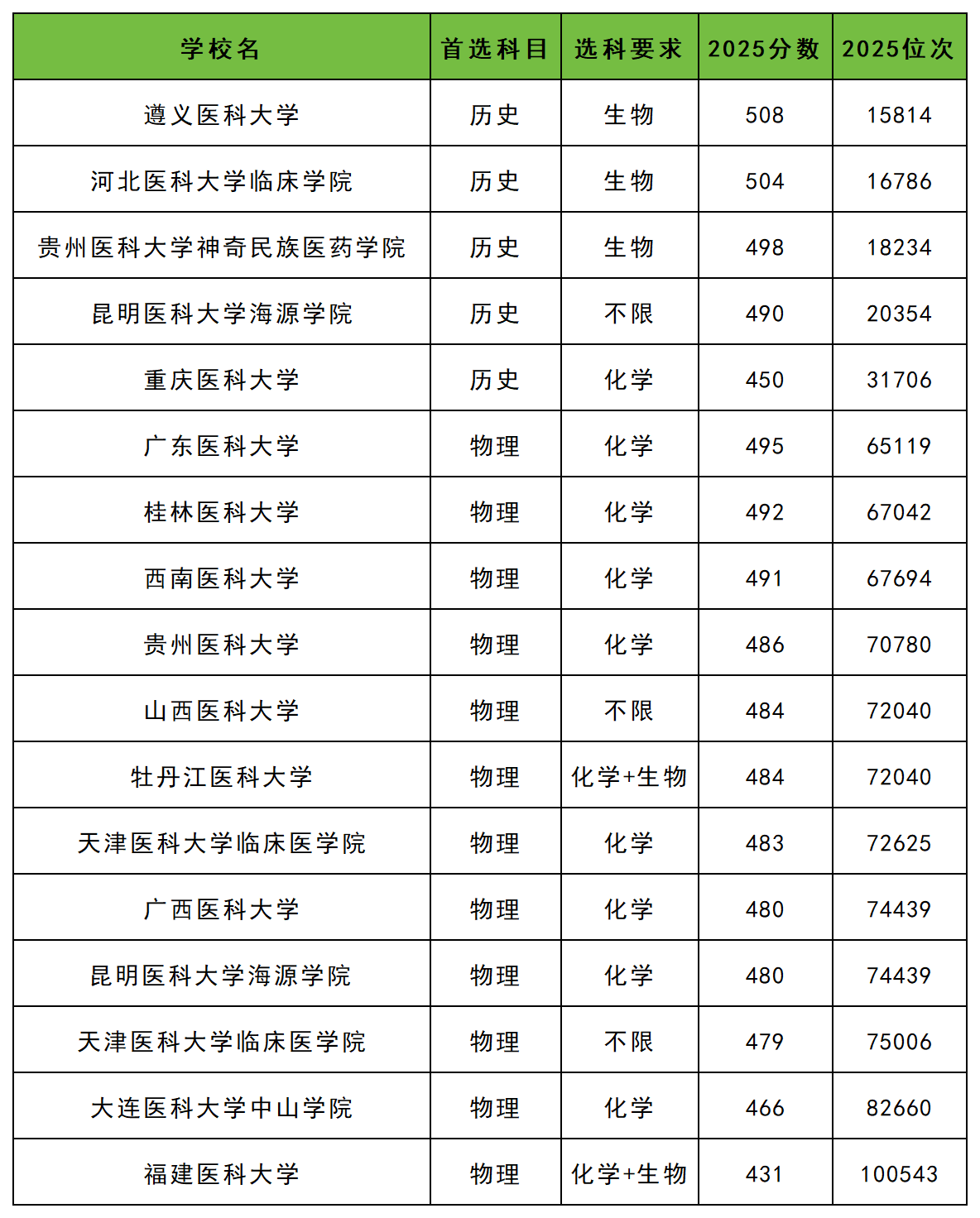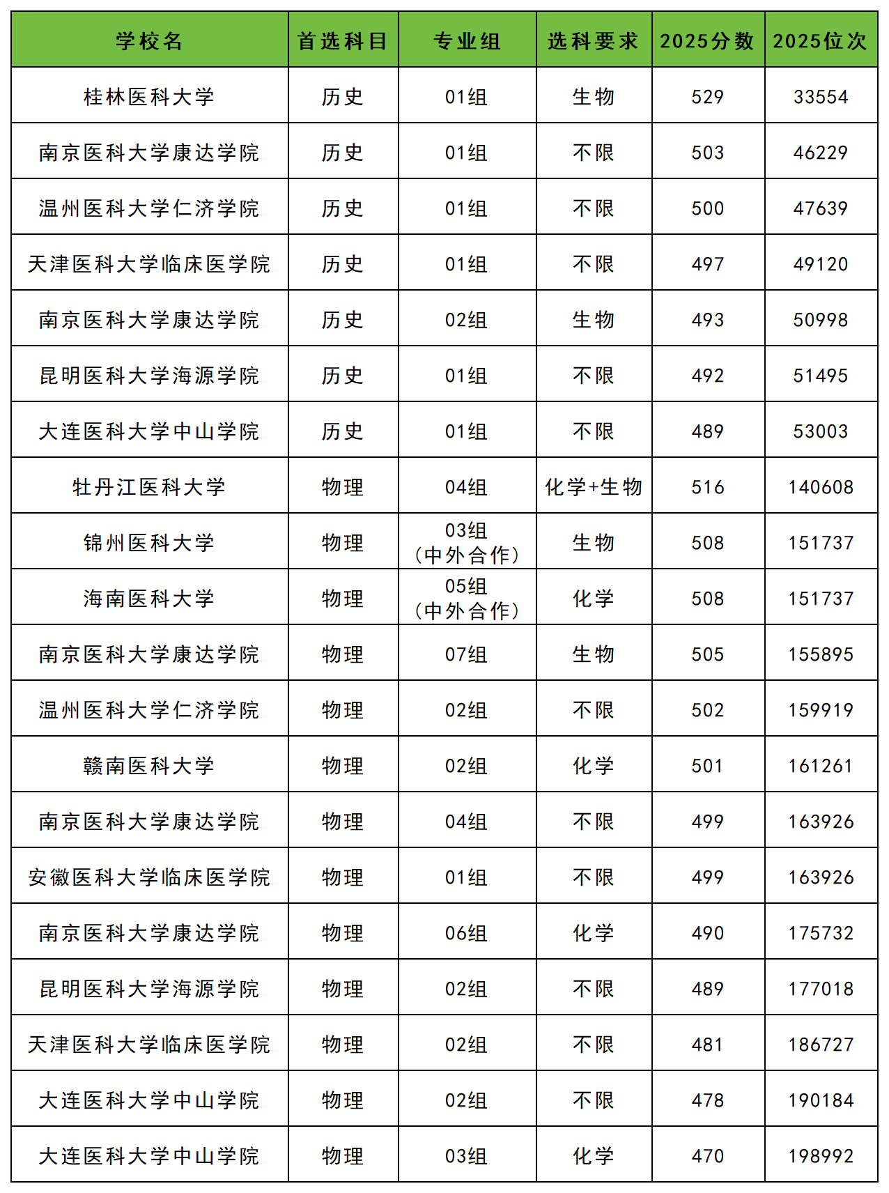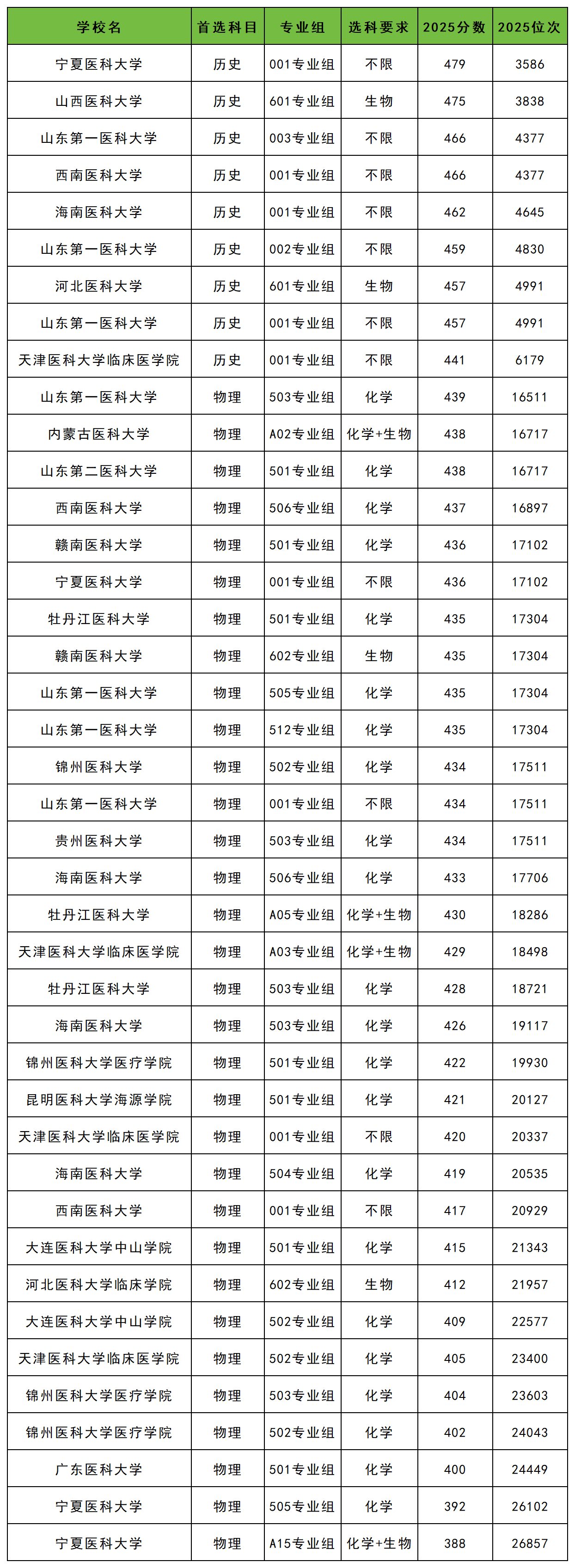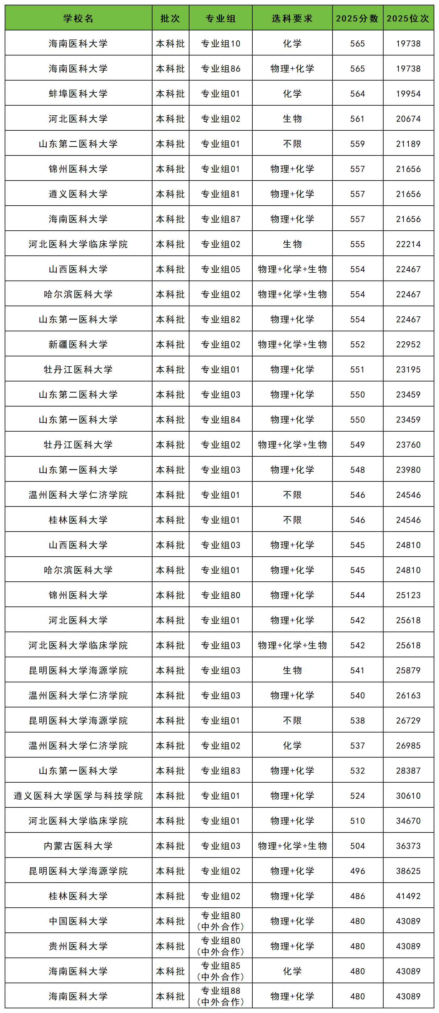 本文仅整理出2025年二本医科大学(新高考省份筛选的是本科线以上、特控线以下的院校)在全国部分地区的录取分数线,供参考。
