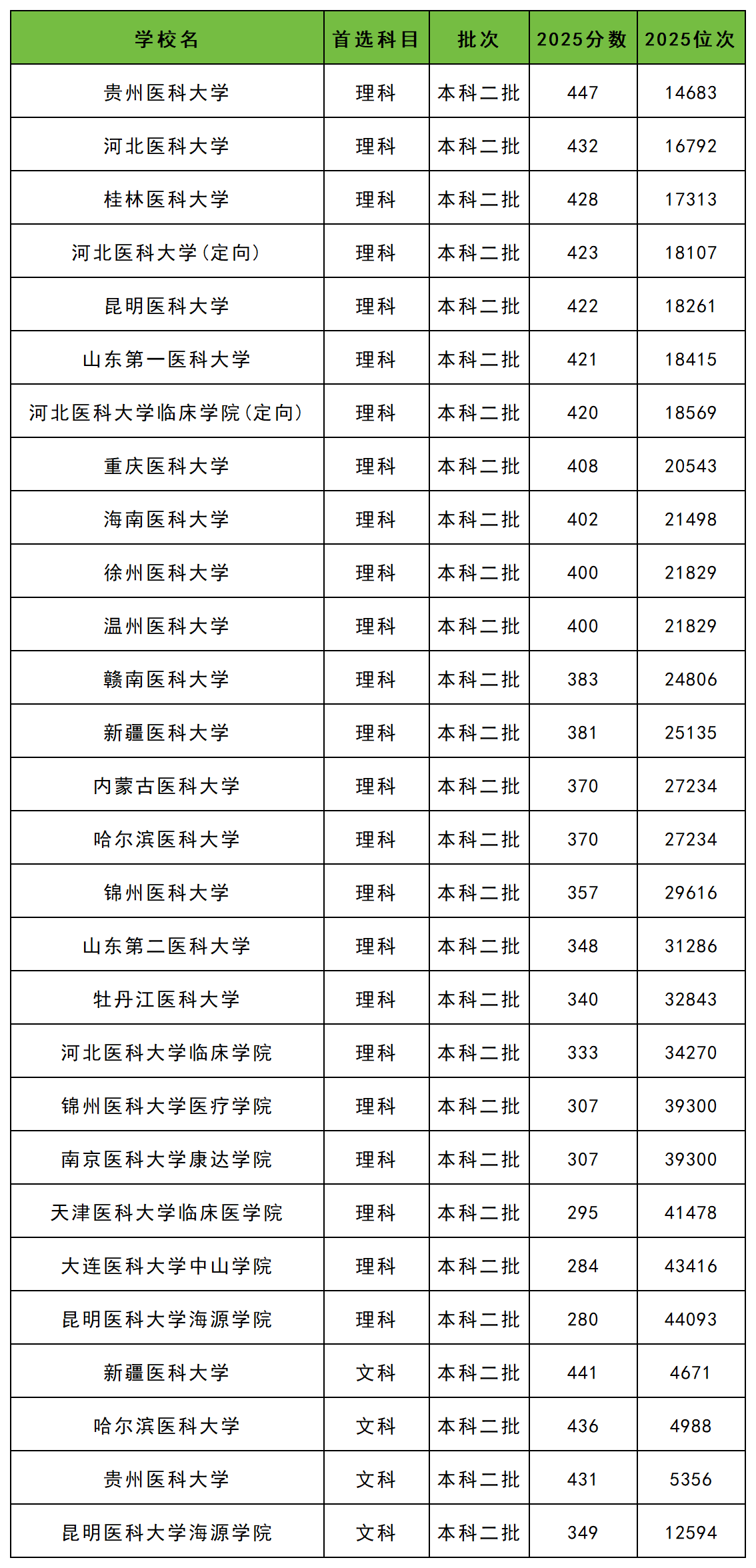2025全国二本医科大学在理科录取分数线280分-447分。最高录取分数线对应院校:贵州医科大学;最低录取分数线对应院校:昆明医科大学海源学院。