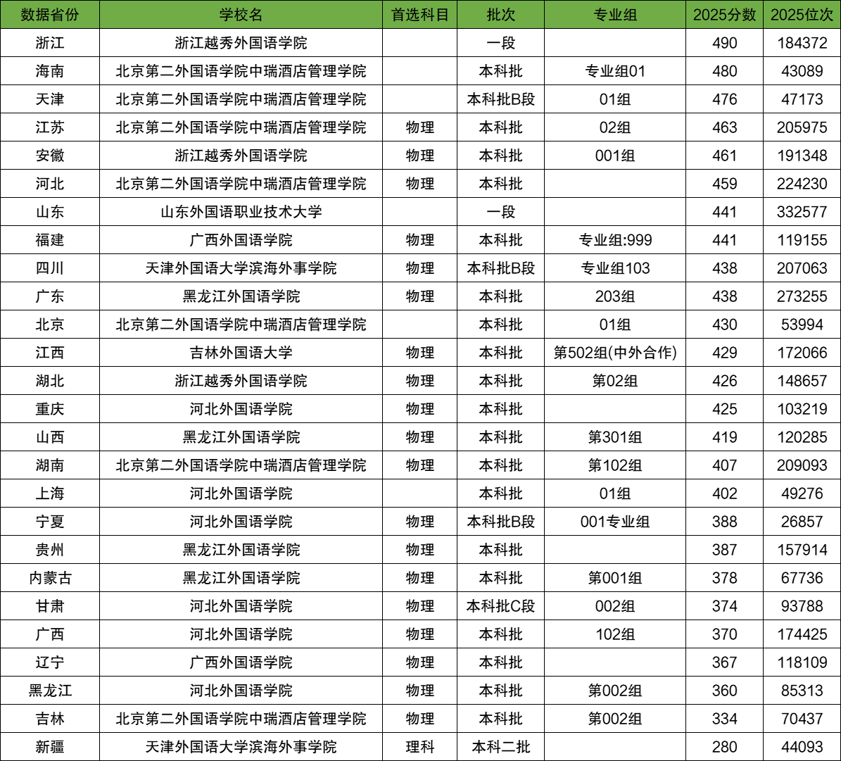 而理科/物理类分数要求最高的地区是浙江,2025年浙江考生至少要490分才能上外国语大学,可上的大学为浙江越秀外国语学院。
