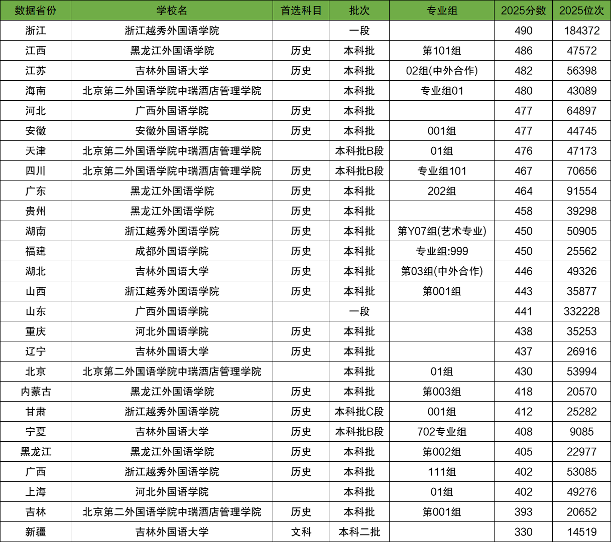 2025年全国文科/历史类分数最低的外国语大学分数范围在330分~490分之间,其中新疆考生上外国语大学的分数门槛最低,2025年新疆文科考生330分即可报考吉林外国语大学,而该分数对应在省排名位次为14519名。