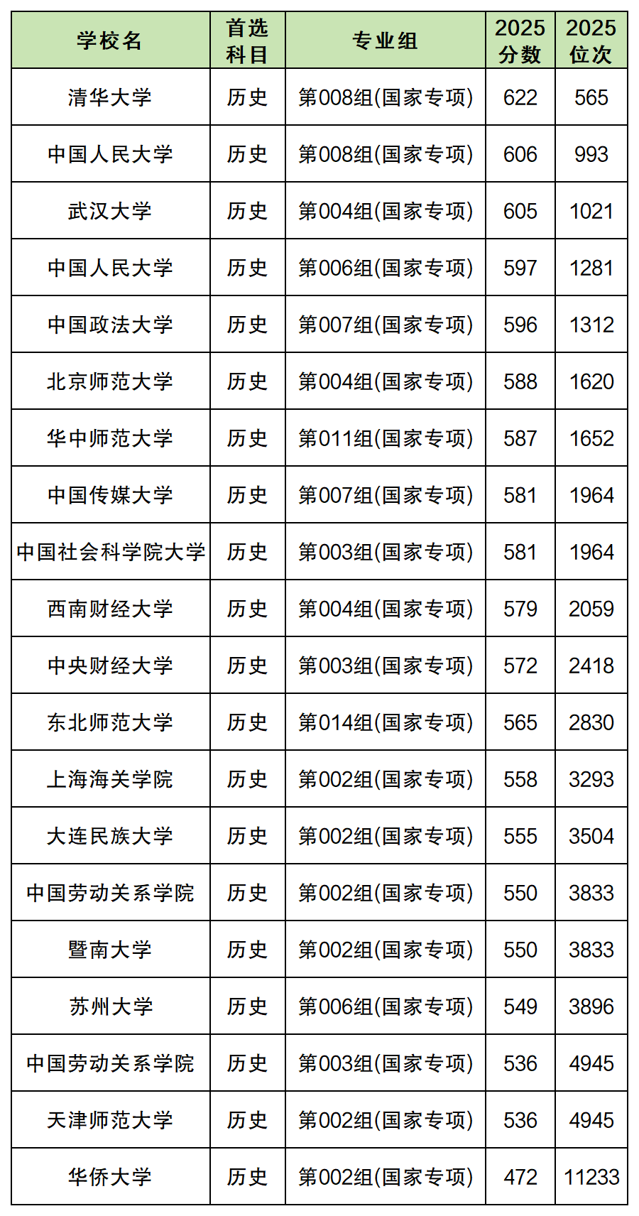 吉林国家专项计划历史类录取分数最低的是华侨大学第002组(国家专项),2025年最低分为472分;相对较低的还有天津师范大学第002组(国家专项)536分、中国劳动关系学院第003组(国家专项)536分、苏州大学第006组(国家专项)549分等。