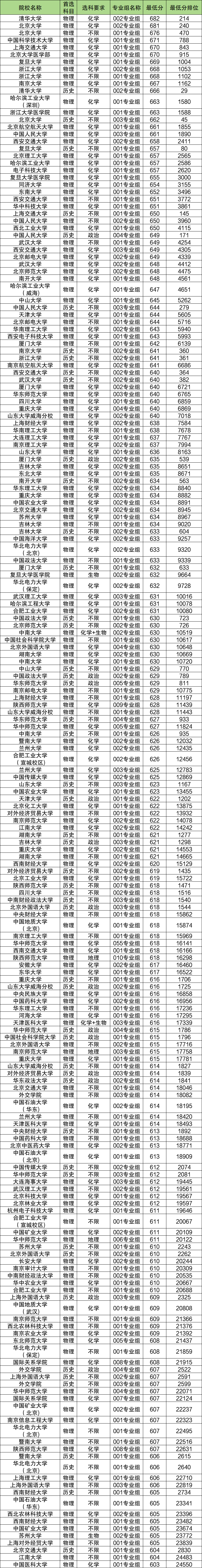 代表院校(专业组)分数:清华大学(002专业组)682分、北京大学(002专业组)681分、中国科学技术大学(001专业组)671分等。