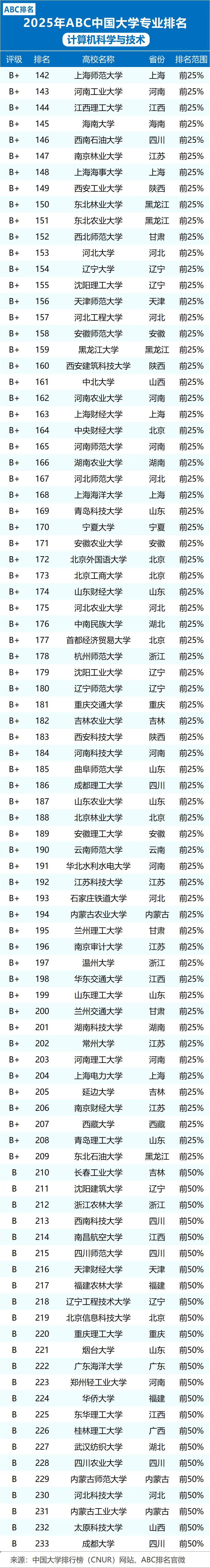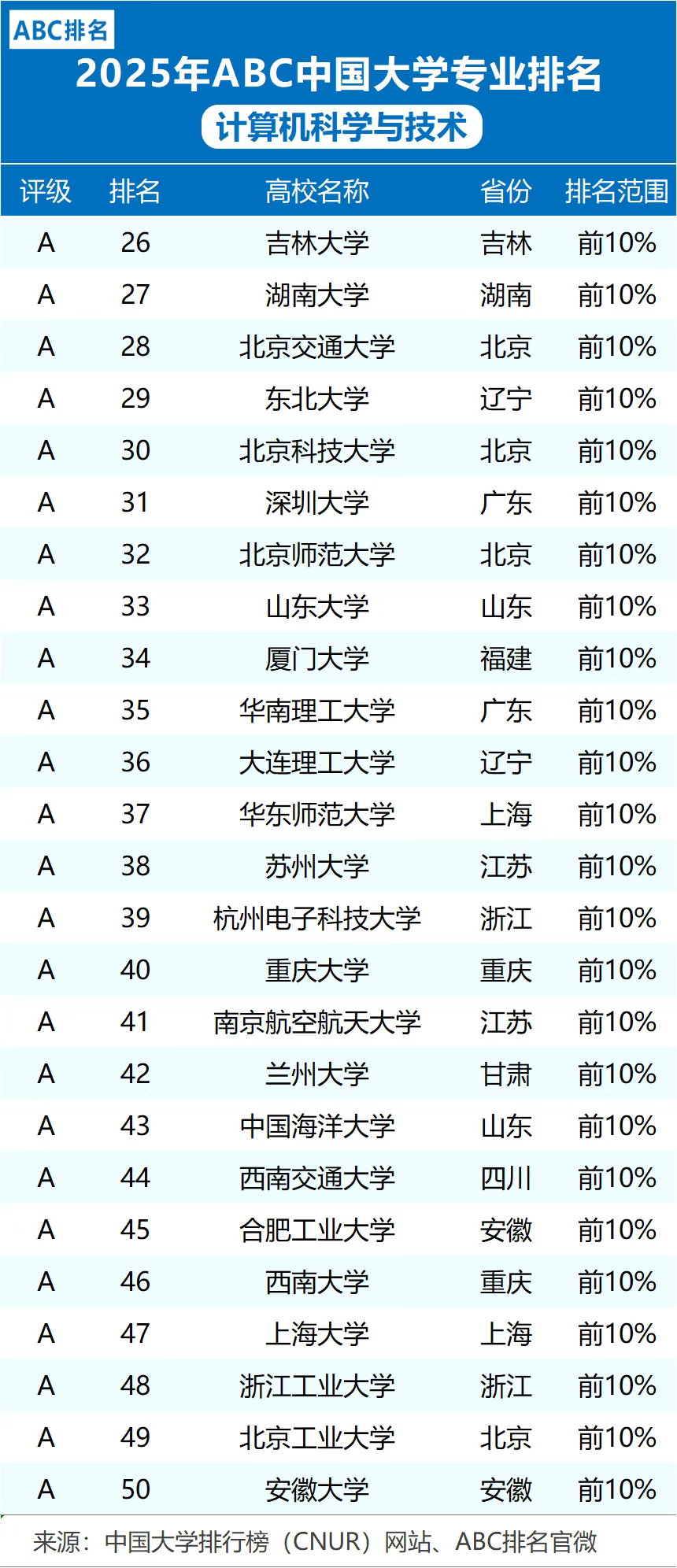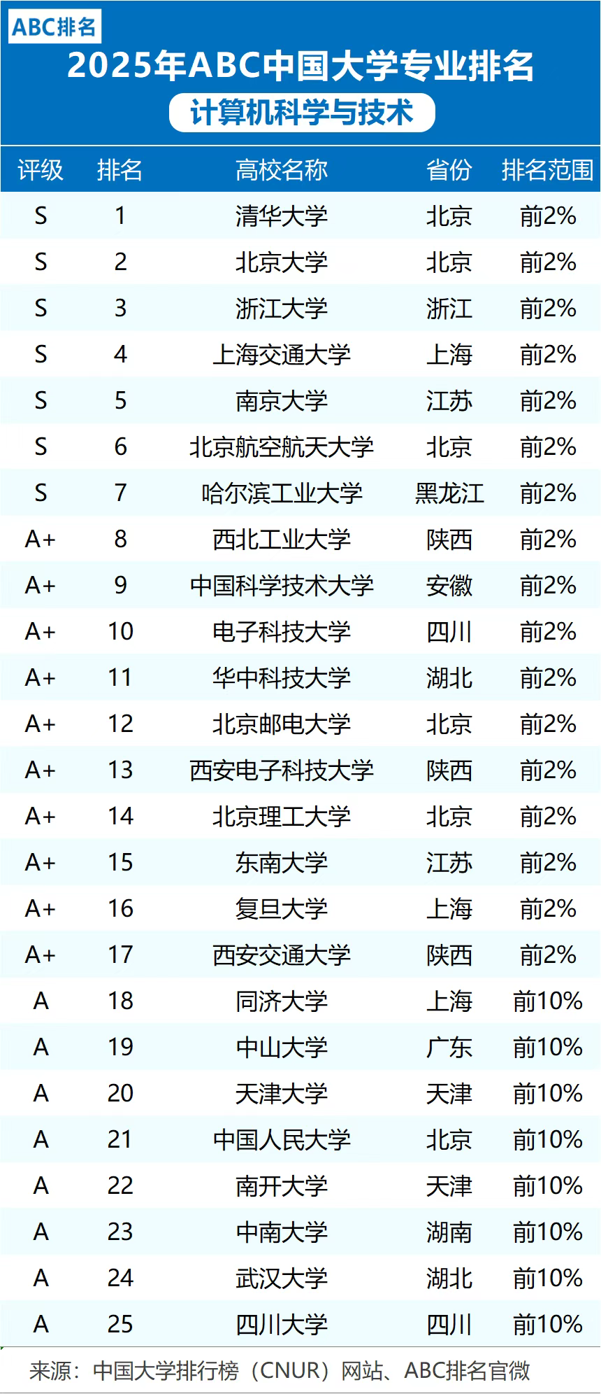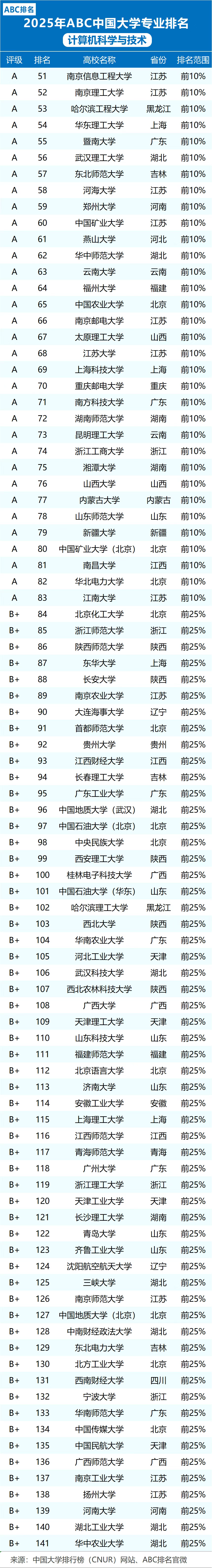 本文参考2025年ABC中国大学计算机科学与技术专业排名,为各位整理了中国计算机专业学校排名前10、前50、前200名的大学名单。