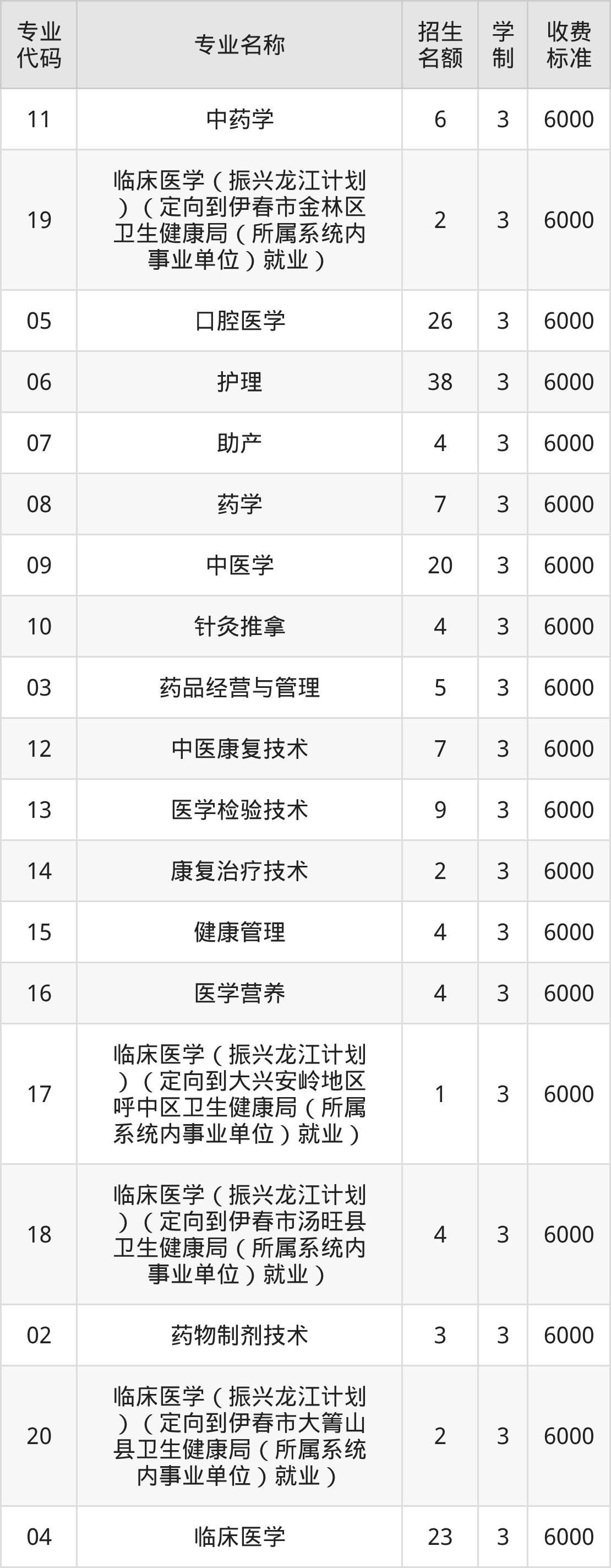 | 20 | 临床医学(振兴龙江计划 )(定向到伊春市大箐山 县卫生健康局(所属系统 内事业单位)就业) | 3 | 3 | 6000 |