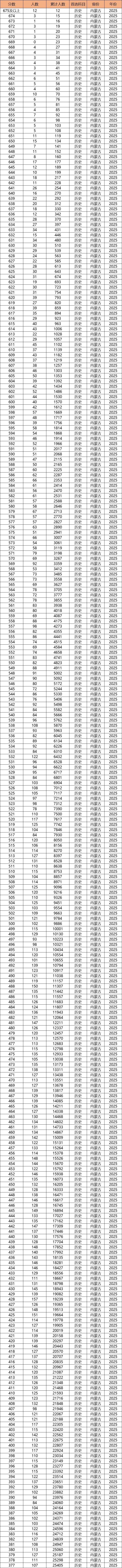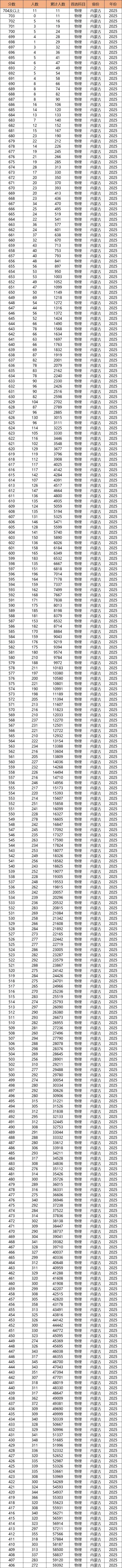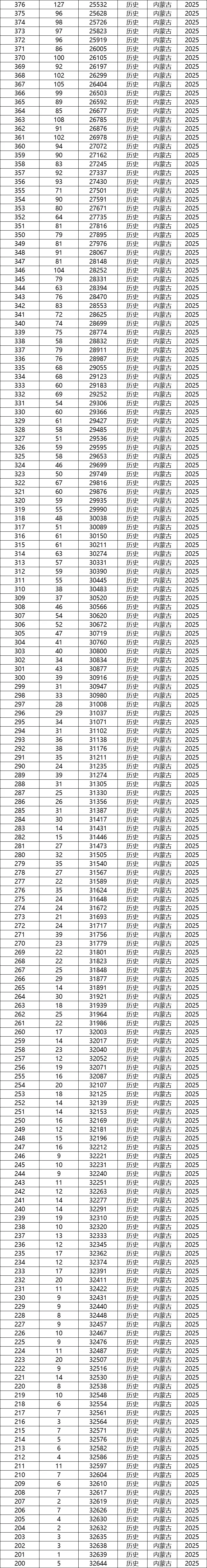 内蒙古2025高考历史类一分一段表已公布,600分以上累计1570人、550分以上累计4823人,500分以上累计9886人,更多分数段详情见下表: