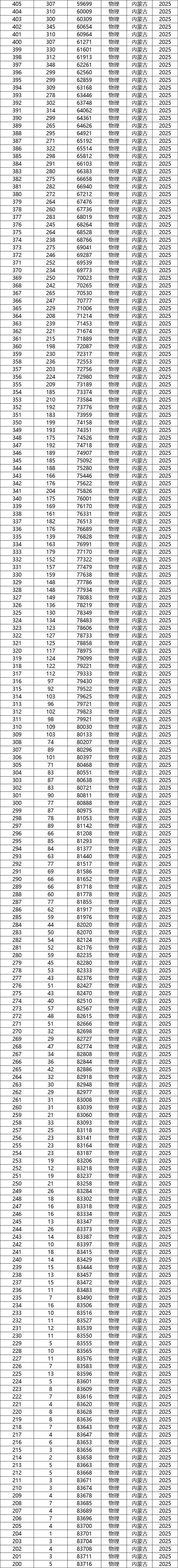 内蒙古2025高考物理类一分一段表已公布,700分以上累计24人、650分以上累计1149人、600分以上累计6349人、550分以上累计16327人,500分以上累计292人,更多分数段详情见下表:
