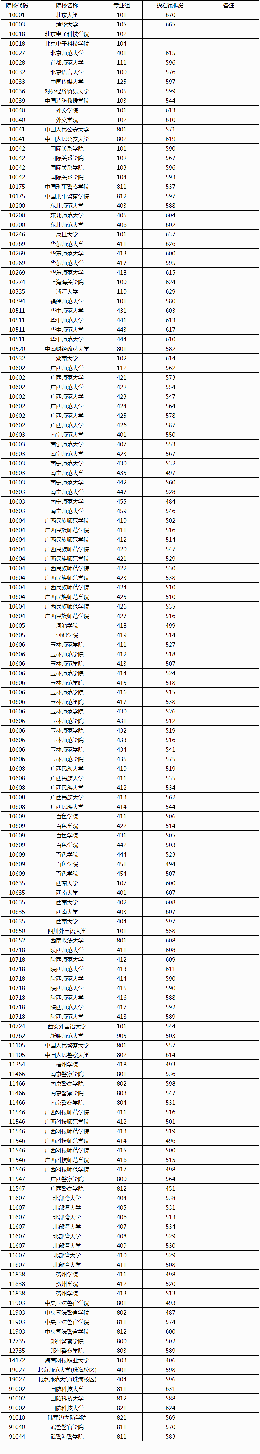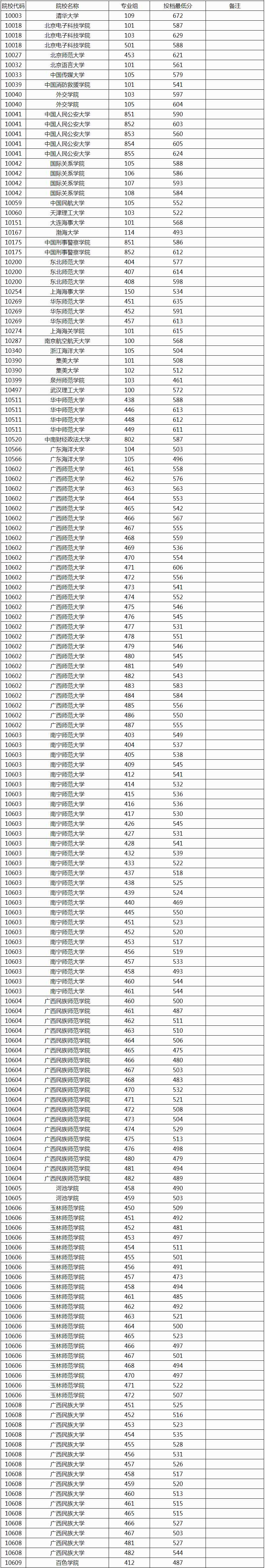 广西师范大学,专业组480,投档最低分为545分;