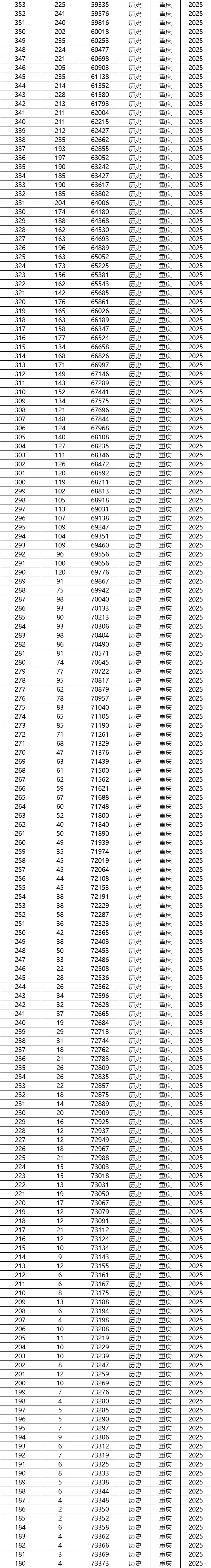 2025年重庆一分一段表已经公布,2025重庆历史物理组分数位次对应表为: