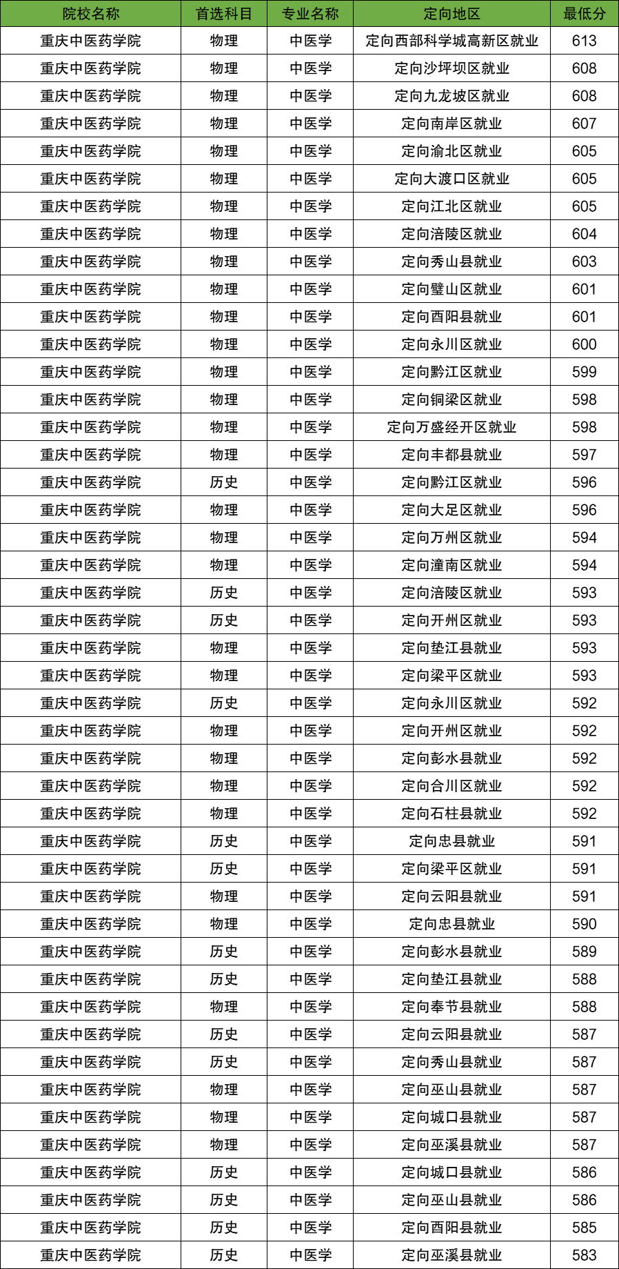 物理类最高分为613分,定向西部科学城高新区就业;最低分为587分,定向巫溪县就业。